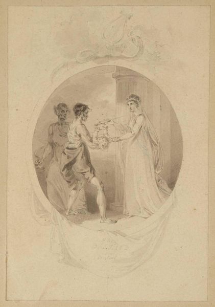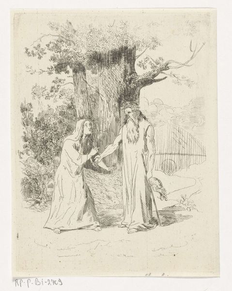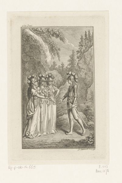 Reinier Vinkeles created this print, "In een park kust een man de hand van een vrouw," using etching techniques. The composition draws us into a seemingly serene park setting. The stark contrast between light and shadow defines the figures and elements. Notice how the artist uses linear precision to define the central interaction: A man bows to kiss a woman's hand while another woman stands close by. The structure is not just narrative but also geometric. Vertical lines of the figures and trees contrast with the bowed line of the man's posture, creating a visual push and pull. Vinkeles engages with Enlightenment ideals of rationality and order. The careful arrangement and clear lines suggest a structured view of human interaction and nature. This structured presentation, however, opens up questions. What emotional complexities might be hidden beneath this veneer of order? The artist is making a commentary about society and power dynamics, viewed through the lens of formal elegance and restraint.