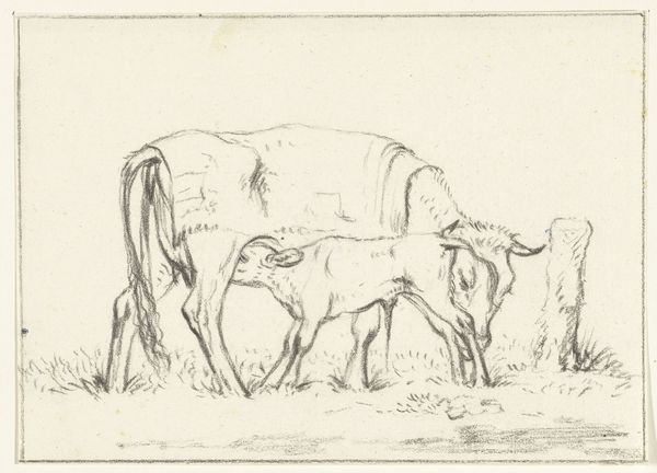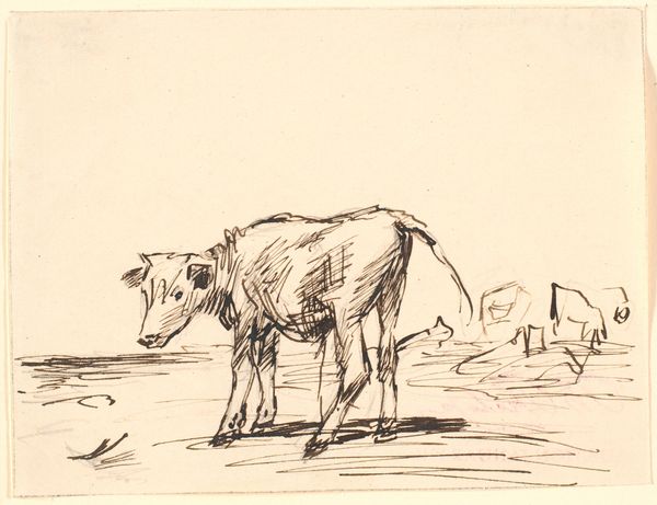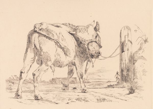 Johan Thomas Lundbye created this etching, “A bull calf tied to a post,” during the Danish Golden Age. The composition is dominated by the calf, its hefty form rendered with fine, energetic lines. Lundbye's technique here isn’t just representational; it's expressive. The dense crosshatching brings a tactile weight to the calf's body, contrasting with the smoother, more open treatment of the landscape. The calf appears monumental, yet its tether and the surrounding pastoral elements evoke a sense of rural tranquility. The composition uses a semiotic language that speaks to themes of nature, domestication, and the picturesque ideal. Consider how Lundbye’s formal choices—the scale of the calf, the use of line to create texture, and the balance between detail and open space—invite viewers to contemplate the relationship between humans and the natural world. It presents not just a scene, but a carefully constructed statement about our place within it.