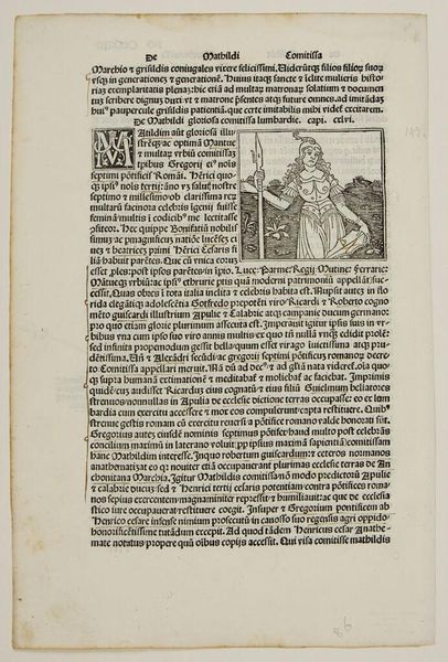 Editor: Here we have an anonymous woodcut, “Queen Theodolinda of Lombardy.” It looks like a page from a book. The queen seems very serene. What can you tell me about the visual elements at play here? Curator: Notice how the artist uses contrasting black lines to define form and space. The queen’s figure, though simplified, conveys a sense of regality through its symmetrical composition and the careful arrangement of decorative elements. The surrounding text, too, contributes to the overall design, balancing the image with textual patterns. Editor: So the composition itself tells a story, not just the image? Curator: Precisely. The visual structure supports and enhances the narrative, creating a cohesive aesthetic experience that communicates power and authority through form. Editor: That’s a very insightful way to look at it; thanks for pointing that out.