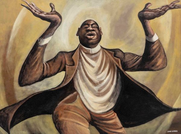Ernie Barnes painted this work, called "Singer," sometime in the late twentieth century. It depicts an African American male singing passionately into a microphone under the bare bulb of a dimly lit space. We know that Barnes was an athlete before becoming an artist, and we know his works often portray scenes of everyday African American life. This image offers a look into the world of a blues or jazz performer, perhaps struggling and under-resourced, but still pouring his heart into his music. The setting, with its cracked ceiling and single light source, speaks volumes about the economic realities for many black musicians. Despite these conditions, the singer's closed eyes and open mouth suggest a powerful emotional connection to his art. The microphone, an early model, is a symbol of technology that helps to amplify his voice, allowing him to reach a wider audience. To understand the painting fully, one might research the history of African American music venues and performance spaces, or delve into biographies and autobiographies of blues and jazz musicians. These sources provide valuable insights into the social conditions that shaped the artistic production of the era.