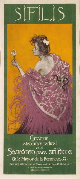 Editor: This drawing by Ramón Casas is the original design for the poster 'sífili', done in pencil and pastel. It depicts a nude woman holding a flower, but what really grabs my attention is the snake draped around her. It creates a kind of tense but alluring feeling. How do you interpret this work, particularly its potential social commentary? Curator: I see it as a powerful, albeit subtle, commentary on the societal attitudes towards women and illness at the time. The nude figure, adorned with the snake—a symbol often associated with temptation, but also with healing—invites us to consider the era’s stigmatization of venereal diseases and the moral judgments projected onto women who contracted them. Editor: That’s fascinating! The snake as healing is a twist I hadn’t considered. So, is Casas suggesting that these women were unfairly demonized? Curator: Precisely. The flower she holds could represent both beauty and fragility, symbolizing the precarious position of these women within a patriarchal society that simultaneously fetishized and condemned them. What do you make of the work's Art Nouveau style? Does it amplify or detract from this commentary? Editor: That's a great question. Its decorative qualities soften the more direct message of symbolism; the visual beauty and graceful lines draw you in, perhaps prompting empathy, which can lead to reflection on social inequalities. Curator: Absolutely. Casas uses the aesthetics of Art Nouveau not just for beauty, but as a Trojan horse, smuggling in a poignant critique of the moral hypocrisy surrounding sexuality and disease. By subverting typical symbols, he challenges us to confront uncomfortable truths. Editor: This has definitely made me rethink my initial perception. The layers of meaning here are so much richer than I first imagined. Curator: It’s a piece that speaks volumes about the era, inviting us to continually question the narratives we inherit and how they shape our perceptions. I have certainly enjoyed discussing it with you.