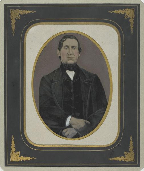 Editor: We're looking at a portrait of a man, painted around 1845 by Thomas Skynner. What immediately strikes me is the starkness of the figure against the warm background. What do you see in this portrait, in terms of symbolism or historical context? Curator: Notice the subject's formal attire – the dark suit, the precisely tied bow tie. These elements speak to the aspirations and the constructed identities of the emerging middle class in the 19th century. Can you feel that ambition simmering just below the surface? Editor: Yes, there’s definitely a sense of someone wanting to present himself in a certain light. The small, possibly a book, on which his hand rests... What does that suggest? Curator: Indeed. The book acts as an attribute. Is he a scholar, a man of leisure? Perhaps. Books were potent symbols of knowledge and status. How does this subtle visual language influence our understanding of him? Does the portrait subtly suggest a new type of power in the Victorian age? Editor: That’s fascinating – the book almost declares a certain intellectual identity. And perhaps there is power in that subtle visual language, compared to older symbols of power, such as family crests. I never considered it that way. Curator: It's about seeing how artists encoded these cultural values into their work, and how we continue to read these signs today, almost unconsciously. Editor: So, through these objects and the figure's presentation, Skynner communicates the sitter's status and ambitions within his historical context. I’ll never look at portraits the same way. Curator: Precisely. And that constant re-evaluation of symbols ensures these works remain relevant across time.