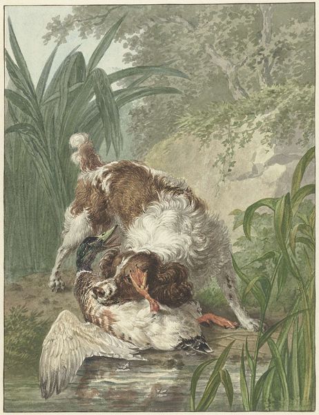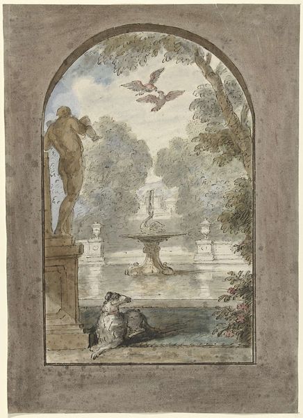 Curator: Isn’t this curious? "Turkey and Other Birds near Classical Ruins in a Park" by Aert Schouman, painted with watercolors sometime around 1756 to 1761. It’s currently at the Rijksmuseum. Editor: It does strike a peculiar balance between the whimsical and the grand. I mean, turkeys hanging out amidst crumbling classical architecture. It's like a feathered commentary on the impermanence of empires. Curator: Absolutely. The Rococo playfulness is so distinct. Imagine Schouman, en plein air, carefully detailing each bird's plumage... he’s composing a little comedy right before us. Do you see the pompous turkey perched atop the sculptural fragment? He’s holding court! Editor: I see the Rococo but I also see a pointed juxtaposition. The birds, symbols of nature's vitality, set against the backdrop of decaying classical structures – they evoke questions around themes of decline and renewal, power and its inevitable ephemerality. Are these ruins standing as metaphors for the collapse of colonialism as nature reclaims what was taken? Curator: Hmm, quite possibly. The ruined columns do lend themselves to that reading, especially considering the history of colonialism in that era. Though I wonder if Schouman’s simply playing with contrasts – the refined ideals of classical art versus the very earthly concerns of barnyard fowl. What seems important, and what's truly essential? It's a layered conversation with watercolor, I’d say. Editor: That’s fair. But to view the setting as mere background overlooks the complex ways in which landscapes can represent specific power dynamics and political contexts. Look how small that soaring bird appears over the decaying structures—are we intended to assume nature or the wealthy have supremacy? It all plays into this tension. Curator: Yes, but ultimately I feel drawn back to Schouman’s close observation of these creatures and what he might’ve perceived as an elegant assembly amidst chaos. It reminds me, sometimes, of my own family get togethers. Editor: Ultimately, perhaps this is a chance for us to reflect on our own contemporary settings and to ask, which narratives and histories do we inherit, and what responsibility do we hold in shaping the landscapes of our own time?
