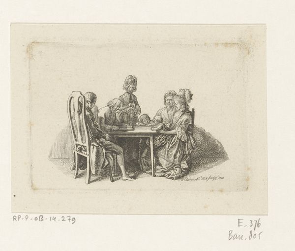Curator: Here we have Henry William Bunbury's "The Bird-Cage," held at the Tate. What's your initial impression? Editor: It feels delicate, almost unfinished. The lightness of the watercolor wash gives it an ethereal quality. Curator: Note how Bunbury uses line to define form, creating an interior scene populated by two figures focused on the central cage. The composition is remarkably balanced. Editor: It certainly draws your eye to the cage itself. I'm curious about the materials used for it; the metalwork looks simple, probably made by a local artisan. The artist, of course, had the freedom to depict them however he wished, with his materials. Curator: Precisely. The cage acts as a signifier for themes of captivity and domesticity, perhaps even the constraints placed upon women of the time. Editor: Thinking about the labor involved in constructing such an object and its ultimate purpose offers a grounding perspective on the symbolism we can read into it. Curator: Absolutely. Seeing the interplay between the material object and artistic intent enriches our understanding. Editor: Indeed. It all comes down to the stories materials and art can tell.