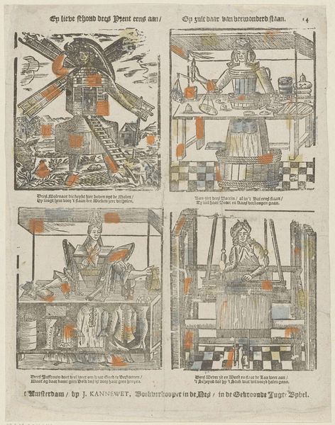 Curator: Here we have a print from between 1743 and 1758, titled "Bybelsche Figuuren, des Ouden Testaments", created by Jan Nieuwenhuyzen. It is currently held in the collection of the Rijksmuseum. Editor: What strikes me immediately is the comic-book-like arrangement of these small narratives; each vignette holds such graphic potential for the time. There’s a forceful visual grammar at play. Curator: Absolutely. Each of these scenes encapsulates stories from the Old Testament, doesn’t it? For example, we can see what appears to be Jonah being swallowed by a whale in the top left quadrant. These images aren’t simply illustrative; they are acting as symbolic touchstones. Editor: Precisely! Think of the whale image – it's less about the zoological reality of a whale and more about representing divine judgment and subsequent deliverance. That fish almost resembles a grotesque theatre mask; it feels performative. What really grabs me are the blocks of solid color against the monochrome outlines. They make the plane really snap into focus. Curator: Good observation. Consider the pervasive depiction of angels. Their consistent appearance highlights the constant intervention of the divine. Moreover, note the recurring architectural details and structured interior spaces within the grid: they lend each little section an iconic importance—and that is enhanced by how Jan chooses to organize his formal patterns of color. Editor: And it is color meant to accentuate—to emphasize moral underpinnings by heightening narrative elements. Curator: So the aesthetic choices echo the underlying cultural narrative. We see not just representations, but active symbols, alive with generations of accrued significance. Editor: Exactly. Looking closely has given us fresh perspectives on this piece—revealing complex symbolic languages.