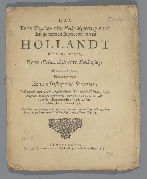 Curator: This captivating book, published around 1766, is entitled "Boekje met de spelregels voor het Nederlands Historiespel, 1738", roughly translating to "Booklet with the rules of the Dutch History Game." It’s a beautiful example of 18th-century printing, authored by Daniel Joannes Langeweg. Editor: You know, looking at this old paper, all aged and slightly browned, makes me feel like I’ve just unearthed a pirate's treasure map. I love that antiquated font—so proper! There's also something whimsical about turning national history into a game; like knowledge becomes entertainment. Curator: Precisely! It reflects a broader Enlightenment trend of using games for educational purposes. Consider that this artifact offers insight into how Dutch history was consumed and disseminated among its elite and middle classes. Think of this as less a textbook and more an invitation to understand nationhood via carefully constructed gameplay. Editor: Right, and you see those slightly rough edges on the pages? They show that time has passed; hands have touched it and eyes have scanned it, making its history even more alive. I find it super-fascinating that this historical text, once so formal, can today invite a bit of childlike play. Curator: Well said. I believe this 'History Game' booklet signifies the intertwining of civic engagement with recreational activity. It presents a carefully curated national narrative which would invite questions about patriotism and collective memory during a crucial period in Dutch history. It gives an institutional framework on something that appears so carefree. Editor: So here we have an artifact that isn’t just some dry historical record but an invitation to actually engage and internalize history, playfully. Makes you wonder: did the Dutch history version of "Monopoly" end in squabbles over New Amsterdam? I would want to find out about other similar examples in today’s day and age, too! Curator: An excellent observation. Its value rests less in the facts it conveys and more in revealing how societies use both fun and games for instruction and even subtle forms of cultural indoctrination. Editor: I love how the very imperfection of the booklet – the yellowed pages, the somewhat fading type – speaks to the human element of history; flawed and wonderful all at once. A really nice one.