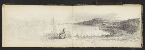 Editor: This is "Gezicht op Hattem," a pencil drawing by Willem Cornelis Rip, made sometime between 1907 and 1908. It looks like a landscape sketch in a notebook. What I find interesting is its very direct, unassuming style. What do you make of it? Curator: Well, that unassuming style speaks volumes about the changing role of landscape art. By the early 20th century, after the Dutch Golden Age tradition and the rise of Impressionism, landscape wasn't just about representing nature; it was about capturing a personal impression, an experience. Rip is engaging with both the detailed observation rooted in tradition and the subjective vision celebrated by the Impressionists, making visible the artist's own process. Why do you think Rip chose this specific view? Editor: Perhaps it held personal significance? The windmills and church steeples feel so…typically Dutch. Curator: Exactly. Rip is participating in constructing a visual identity for the Netherlands. These landscapes became powerful symbols of national identity. Think about how images like these circulated – in postcards, books, even advertisements. How do you think this impacts its meaning today, seen here, in a museum? Editor: That's fascinating! Knowing its role in shaping national identity makes me see it differently. I see a historical record now, not just a simple landscape drawing. Curator: And how the display of such sketches within museums grants an even deeper validation and importance of everyday experience, as a reflection on both the artist’s intimate process and broader cultural values. We tend to think of landscape art as passive observation, but it’s really active participation in cultural identity. Editor: It makes me rethink what landscape can do. Thanks for your insight! Curator: My pleasure. Seeing it through your eyes helped me think about how it continues to operate within the national consciousness.