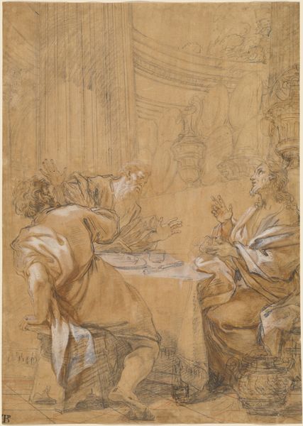Curator: Here we have Sebastiano Ricci's "Christ and the Samaritan Woman," an ink drawing on paper from around 1718. It seems like a quick preparatory sketch, full of energy. Editor: Yes, the dynamism is palpable! Look at the bold strokes; it has a raw, almost urgent feel. The figures appear to emerge from the page itself. There's something very immediate about it. Curator: Ricci was working within a Baroque tradition, of course, where drama and movement were highly valued. But the choice of this subject is interesting. Editor: Indeed. The encounter at the well is rife with symbolic significance. Water, in this context, often signifies spiritual cleansing, renewal, and the gift of life. The woman's vessel suggests both her worldly duties and her potential for grace. Curator: It highlights a crucial narrative—Jesus offering salvation to someone on the margins of society, a woman, a Samaritan. It speaks to the inclusive message at the heart of Christian teaching, even if expressed through the biases of 18th-century European sensibilities. How do you see that manifesting here? Editor: I see it in the slightly theatrical pose of Christ, one arm outstretched, almost like an invitation, or perhaps a benediction. Even in this quick sketch, you sense the weight of cultural expectation around his image, versus the Samaritan woman's relative anonymity within the artistic rendering. Curator: And it was likely created for an elite audience that consumed imagery affirming those power dynamics, subtly reinforcing social hierarchies even while portraying a story of supposed spiritual egalitarianism. It reminds me that representations of this story change as cultures do. Editor: A powerful reminder that even sacred narratives become enmeshed within broader societal currents. I'm struck once more by Ricci's expressive lines. It's a simple scene, but carries within it layers of social history. Curator: Agreed. These sketches offer fascinating glimpses into both the artistic process and the broader cultural contexts in which art is produced and received. It's a testament to the story’s enduring power and its flexibility through the years.