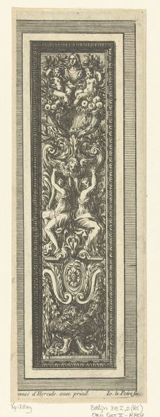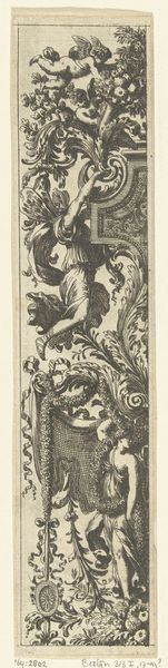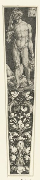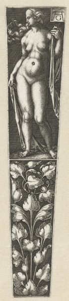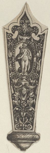 This ‘Dagger Sheath with a Nude Woman Above’ was etched by Heinrich Aldegrever in the 16th century. A seemingly simple design, it presents a powerful combination of motifs. The nude female figure, reminiscent of classical Venus, has roots stretching back to ancient fertility cults. Her nakedness, while sensual, symbolizes purity and truth. The floral patterns below, seemingly decorative, echo the cyclical nature of life, death, and rebirth. One might consider Botticelli’s ‘Birth of Venus’ where a similar nude figure emerges, reborn from the sea. It is a motif that resonates through time, recurring in various forms, each reflecting its era's unique cultural anxieties and aspirations. The dagger sheath, a masculine symbol of power and protection, is softened by the female figure, representing a balance, a harmony of opposing forces. This interplay engages our collective memory. The image taps into primal urges and fears, leaving us both intrigued and perhaps, subconsciously unsettled by the potent symbolism embedded within its design.