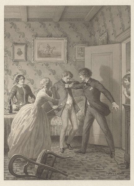 Theodor Kittelsen rendered this drawing, "Klokkeren I Bygden Vor", capturing a somber, perhaps cruel, domestic scene. The most striking element is the foot pressing down, an ancient symbol of domination that can be traced back to Roman military triumphs, where the victor placed his foot upon the defeated. Here, the act lacks glory, instead suggesting a brutal exercise of power within the confines of what appears to be a home. Note the subtle smirk on the face of the onlooker. This motif of subjugation evolves through time, appearing in religious contexts, where saints triumph over evil, and in political propaganda, reinforcing hierarchies. The psychological impact is undeniable; the image taps into primal fears of oppression, resonating with our collective memory of power dynamics, engaging viewers on a deep, subconscious level. Thus, the motif endures, shifting from expressions of grand victory to more intimate, unsettling displays of control.