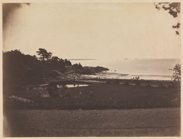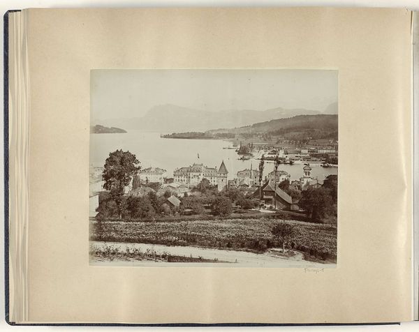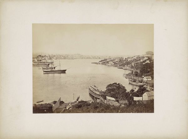 Editor: Here we have a gelatin-silver print, tentatively titled 'View of the harbour of (presumably) Sydney with a boy in an orchard in the foreground,' attributed to Charles Bayliss, dating from around 1890 to 1910. The composition, with this dramatic contrast between the orchard and the harbor, strikes me as quite deliberate. What stands out to you in terms of formal qualities? Curator: The layering is indeed pronounced. Consider the relationship between foreground and background; the orchard's darkness and detail versus the harbor's receding lightness and simplification. Notice how this pushes the spatial relationships and flattened planes, typical in Pictorialist photographs. Editor: So the spatial ambiguity is a key component of this pictorial style? Curator: Precisely. The tonal range, muted and atmospheric, also serves this purpose. Bayliss employs soft focus and a limited grayscale, dissolving sharp edges and obscuring detail, which pushes the semiotic elements to create mood. It is less about recording a precise likeness than evoking a feeling. Editor: Do you think the 'boy in the orchard' provides narrative, or serves more as an element to emphasize this artistic approach? Curator: It’s both, I believe. Formally, he’s a focal point, directing the eye toward the harbor. But narratively, this element is less important to our semiotic understanding of the image than the relationships that make it compelling. Editor: That makes sense. It's fascinating to see how the formal elements create this dream-like quality. Thank you for expanding my understanding. Curator: My pleasure. Observing the relationships between foreground and background elements shows that formal choices like those can powerfully alter a work.