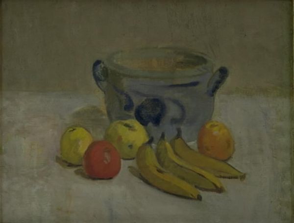 Curator: This oil painting from around 1823-1826 is called "Still Life with Lemon and Cut Glass" and was created by Maria Margaretha van Os. Editor: There’s a curious tension. The cut glass and vivid yellow of the lemon say luxury, perhaps even decadence, but the composition is so tightly cropped, and the color palette, except for the lemon itself, so subdued. It hints at restraint, doesn’t it? Curator: It absolutely speaks to a controlled societal framework, yes. Still life paintings during this era, especially those rendered with such meticulous detail, often functioned as coded messages about wealth, morality, and social status. The presence of a lemon, frequently imported and relatively expensive, signifies prosperity. Consider who has access to such luxuries. Editor: The butterfly, too, doesn't it? Emerging perhaps, finding new beauty or freedom? It adds a layer to what might have just been read as an object study or domestic scene, maybe pointing towards self actualization. Curator: Absolutely. The butterfly and the cut lemon act in contrast, however, the objects signify how far one is, yet, from achieving personal or economic stability in a colonial framework. These images serve, both today and when this was originally painted, as ways to negotiate how femininity operates in our public and private spheres. It suggests that, while beautiful objects might provide temporary escape, true freedom remains out of reach for marginalized peoples. Editor: I hadn't considered that specifically, but it tracks, especially knowing the societal structures within the time the painting was made. What’s interesting, too, is that Van Os was a woman, a woman creating commentary, both with, and against, accepted visual culture of the day. Curator: Precisely! This brings another layer of meaning to this canvas and makes us question whose perspective are we encountering when we look at objects. What we interpret is through both our lenses and hers. This pushes for visibility of identities that were suppressed throughout modernity and urges us to acknowledge them in contemporary social environments. Editor: It's a remarkable piece, far more complex than a first glance suggests. It demonstrates the ongoing ability of art to make a dialogue through both temporality and history.