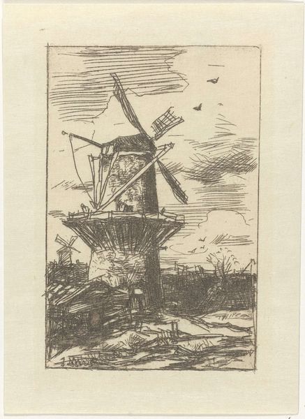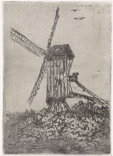 Louwrens Hanedoes created this etching, titled "Molen," using delicate lines and a muted palette to evoke a quiet scene. The composition is anchored by the windmill, its form rendered through a crosshatching technique that gives it a textured, almost porous quality. This technique is mirrored in the depiction of the surrounding landscape, where the grass and sky dissolve into a network of fine lines. The windmill is not just a subject but a structural element; its verticality is a counterpoint to the horizontal lines suggesting the land, and its static presence contrasts with the implied movement of the turning sails and the distant birds. The entire image flattens perspective, drawing attention to the surface of the print, and creating a sense of depth. Hanedoes’s use of etching transforms the mundane into an exercise in visual poetics, where the structural interplay of line and form invites us to reconsider our perception, revealing the symbolic richness inherent in simple objects. The etching transforms a familiar scene into a study of form and light, capturing the ephemeral nature of vision itself.