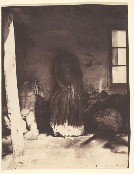 Curator: So, here we have Alfred Stieglitz's photograph "The Last Days of 291," taken in 1917. It depicts the interior of his gallery, right before its closure. Editor: A little mournful, isn't it? Like an attic of lost dreams, full of veiled figures and shrouded objects. All sepia-toned memories. Curator: Precisely. Stieglitz's 291 gallery played a vital role in introducing modern art to America. It championed avant-garde artists, both European and American, pushing boundaries and challenging conventional tastes. Editor: That central sculpture...it looks like a warrior, all tied up. Makes you wonder what battles the gallery was fighting, and why it had to surrender. And that translucent cloth... Is it meant to be hiding something, or revealing it? Curator: Perhaps both. The gallery faced increasing financial pressures and, with the onset of World War I, a shift in cultural priorities. Stieglitz photographed the space as a farewell, a record of its impact, and perhaps, a commentary on the changing times. Note the objects, these various sculptural elements, some his own work, alluding to art being put to rest. Editor: Art as a casualty of war… grim, but it makes sense. You see these kinds of melancholic farewells often, when progress pauses, and people start reassessing their beliefs, the mood always comes off like the aftermath of a grand celebration—beautiful yet poignant. I feel that mood deeply looking at this scene of captured art, even its staging appears considered. Curator: It's certainly a layered photograph, reflective of Stieglitz’s commitment to pictorialism but pushing beyond pure aesthetic beauty. This echoes larger questions about the role of art spaces during times of social and political upheaval. Editor: Makes you appreciate the galleries and studios we have now, and wonder about their future, doesn't it? Everything fades, changes or finds some kind of an end eventually, including cultural bastions. This is just something to ponder over now... I think I'll take one last lingering look.