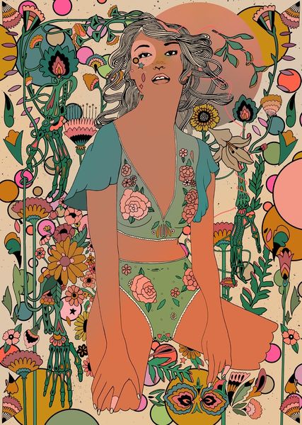 Art Historian: Let’s explore this mixed-media piece. The artist Cassidy Rae Marietta titled it "good chemistry". Immediately I’m struck by the convergence of Eros and Thanatos in a lush garden. What is your first impression? Curator: It has an immediately arresting design. The high-contrast color palette within that ornate, Art Nouveau frame creates a visual intensity that pulls you in. The eye bounces all over. It almost feels decorative…but unsettling. Art Historian: Indeed. The skeletal figure embracing the woman—death embracing life. Then all of the growth erupting behind and around them. These erotic art floral themes remind us that beauty is always accompanied by decay. Note the black crescent moon. Curator: And look at how that stark black crescent creates a dramatic negative space. Formally speaking, it balances the weight of the figures huddled below. It is as if even at the moon's quietest, the chaos beneath will forever reach skyward. Art Historian: Yes. I read that black moon as potent symbolic charge in a work of fantasy. I perceive here strong undertones of fertility and feminine power within a landscape of both beauty and symbolic violence. Do you agree that nature becomes eroticized in ways beyond a mere stylized landscape here? Curator: I can see that in how the flora, though quite stylized, also becomes intensely textured with all these colors; but, while one might recognize botanical forms, what the art work appears to be emphasizing is line and color. I think in general what the forms are 'meant to signify' in an explicit way feels very loosey-goosey! Art Historian: Perhaps. It feels to me that in positioning nature alongside our figures this piece considers that we're caught in its cycles. That pattern, and the figure of the feminine—not any clear objective reference in nature itself— becomes the real focus here. Curator: I see what you mean. Even the woman's dark hair is flecked with a starry pattern that is visually interesting: but the patterns feel very insistent here. To me this gives it an undeniable sense of artifice; nature mediated and intensified via an almost manic need to embellish everything on display! Art Historian: This contrast perhaps reveals an uncomfortable dance with our mortality... So beautifully composed in such vivid terms. I shall think about its relation to nature some more. Curator: Indeed, It offers many possible points of visual investigation in a dizzying design!