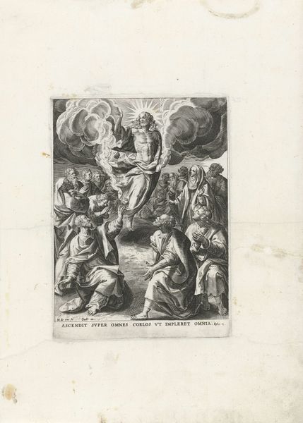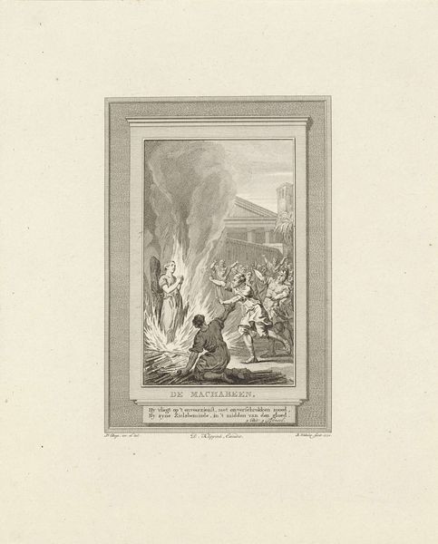 Curator: This engraving, "Enkele figuren kijken naar een engel" by Reinier Vinkeles, housed in the Rijksmuseum, presents such an interesting intersection of the spiritual and the tangible. The baroque style really leans into this contrast, wouldn't you agree? Editor: It does seem very theatrical! I'm struck by how Vinkeles uses light and shadow to create this really dramatic effect, especially with the angels contrasted against what looks like hellfire. What can you tell me about how prints such as this functioned within its period? Curator: From a materialist perspective, this work exists not purely for aesthetic appreciation but as a commodity within a specific social structure. How were prints like this circulated and consumed, and what does this tell us about access to art and the spread of ideas at the time? Consider that this image would have been reproduced for wide circulation, influencing public opinion and social norms. What economic factors enabled Vinkeles to produce these engravings? Editor: That’s interesting. So, instead of seeing it as just a representation of a religious narrative, we should consider it as part of a wider network of production and distribution? I see your point. Curator: Exactly! Consider the labor involved in the printing process, from the engraver’s skilled hand to the workers operating the printing press. These processes are embedded within this image, shaping our interpretation and appreciation. Editor: Looking closely, I'm now much more aware of how this wasn’t created in a vacuum, and was the result of the labor of many hands beyond Vinkeles. I had previously not considered prints this way. Curator: Absolutely! Each print also represents raw materials extracted and then transformed via labor and energy. It's a far richer way to approach art. Editor: It really does put everything into perspective. Thanks!