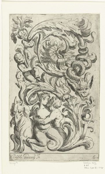 Jean Lepautre created this panel with a seated nude man using etching. Lepautre lived and worked during a time of strict social norms, when representations of the human body were highly regulated. The male nude, a recurring theme in art history, has often been used to explore ideals of beauty, power, and vulnerability, yet also to express the male gaze. Lepautre’s work reflects the complex relationship between desire, morality, and representation in the 17th century, while playing with gendered expectations through its delicate rendering and ornamental context. Consider how the viewer's gaze is implicated in this portrayal. How does the artist balance the classical tradition of the nude with the specific social and cultural expectations of his time? This panel is an intimate study that encourages a dialogue between historical artistic practices and the enduring presence and exploration of identity in art.
