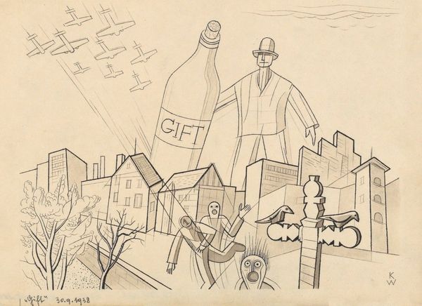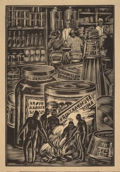 Curator: This graphic art print, likely a poster, created sometime between 1918 and 1919, is titled "Philips zonlicht. Kleuren kiezen bij avond." It resides here at the Rijksmuseum. Editor: My initial impression is dominated by a cool, almost monochromatic scheme—varying shades of blue give the image a distinctive but slightly somber mood. Curator: The artwork immediately situates the Philips lightbulb as a sun, doesn’t it? Before widespread electricity, light represented progress, modernity, and a shift away from darkness—quite literally. It symbolizes a transition in society. Editor: Indeed. Compositionally, the bulb radiates outwards, and its circular form mirrors the circularity of the spools and even the artist's palette below, visually tying the piece together, establishing a clear visual hierarchy. The dynamism emerges from these radial lines juxtaposed with the rectilinear shapes. Curator: Notice how textiles, carpets, and what appear to be spools of thread populate the left of the piece, implying warmth and artistry in the home, under a "Philips zonlicht." Light empowers makers to create and design long after daylight hours. Editor: The materiality—likely printed en masse—works almost paradoxically to highlight this idea of the domestic, the unique crafted object illuminated. The texture of the print becomes almost invisible in service of the illusion. The composition leads your eyes on an interesting voyage across different objects and scenes. Curator: In Dutch Golden Age art, light frequently played a crucial role, particularly as a tool for imbuing spiritual meaning into quotidian scenes. Here, electricity is the "spiritual" force enabling the Dutch home in the modern age, still subtly referencing Dutch tradition. Editor: Looking closely at the texture, I would argue, challenges that spiritual depth. We're reminded of mass production through the print's clear form. The bold type also flattens perspective—foregrounding advertisement. The symbolic depth may be overridden in part by sheer visibility, accessibility. Curator: Ultimately, whether for art or for industry, this artwork evokes a sense of transformation, offering a glimpse into how a simple technology reshaped the perception and practice of daily life. Editor: A striking visual encapsulation of modernity in action.