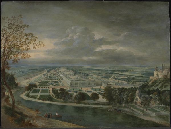 Editor: Here we have an anonymous painting, "Landscape," made with oil paint sometime between 1634 and 1688. The rendering is very interesting, the colours feel muted, almost brown and desaturated and a low-lying fog. What can you tell me about this piece? Curator: Well, considering the time period and the extensive use of oil paint, it's important to analyze the pigment. This type of earth-toned color scheme often meant the use of readily available, and thus cheaper, pigments. Were they attempting realism or reflecting economic constraints on the artist, workshop, or patron who commissioned it? Editor: That’s an interesting perspective. So, you're focusing less on the subject matter—the landscape itself—and more on the physical components of its creation and how that affects meaning? Curator: Exactly. The brushstrokes themselves tell a story of labor. Notice the uniformity in the application of paint in the sky versus the details given to the figures in the foreground; there may have been different people with different skill levels applying the paint to the canvas. Also, we could explore the availability and trade of materials during this period. Editor: I see. So, the origin and trade of pigments and the artistic skill or status implied by brushwork, adds layers of understanding beyond the serene landscape depicted? Curator: Precisely. Consider the linen canvas itself – its weave, its preparation. Was it locally sourced or imported? Each decision, from the ground up, is a reflection of the social and economic landscape within which the artist operated. Don't get me wrong, it’s pretty, but why it looks and feels “pretty” is critical here. Editor: So, understanding the process and materials opens up a richer appreciation for not just the artist, but also the culture that produced this work. I'll never look at landscapes the same way. Curator: Indeed. It shifts the focus from aesthetic appreciation to a more comprehensive understanding of production. It forces us to consider the conditions of making and how those conditions shaped the final product.