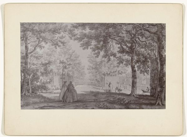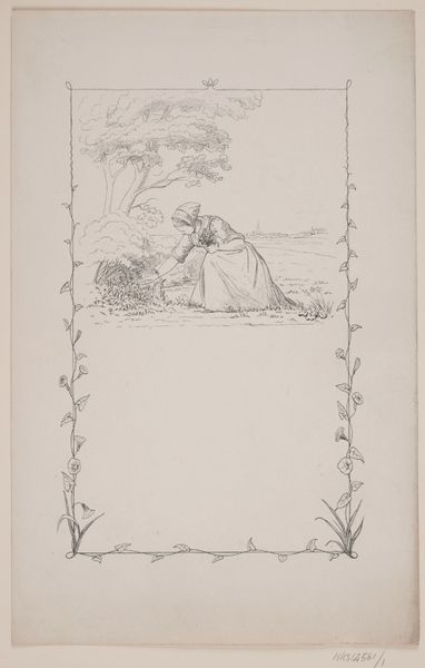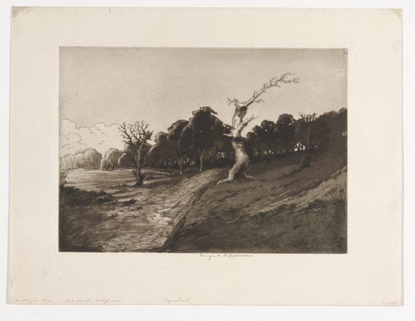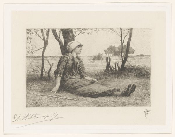 Curator: This etching, titled "Weide in de buurt van Beuzeval", by Henry Lerolle, invites us into a quiet rural scene. It dates from the period of 1858 to 1913. Editor: It strikes me as a rather melancholic scene. The fine lines create a hazy atmosphere, and the lone figure contributes to a sense of isolation, even in nature. Curator: It's compelling to think about the pastoral idyll alongside the realities of labor and gender. Note the woman seated; is she resting or perhaps positioned in the work that women were confined to? The cow nearby feels emblematic of their connected labor within agricultural systems. Editor: Precisely! Look at how the materials themselves – the etching and the paper – serve the depiction of the working classes. The line work implies reproduction of prints accessible and meant for distribution, a commodity to be consumed, mass appeal from something often unseen, the labor of rural work. Curator: And, perhaps more deeply, this invokes a critique of class structures. Lerolle, through a medium readily reproducible and widely accessible, highlights those very inequalities in social standing and wealth. It opens a space to examine issues of social justice inherent within seemingly gentle rural settings. Editor: The scale of this etching seems important. Its intimacy demands a close look. There’s an interesting contrast, isn’t there, between the artist’s hand, the reproducible medium, and the eventual distribution of that labor and image. It almost mimics the processes within the rural landscapes depicted in "Weide in de buurt van Beuzeval". Curator: This interplay certainly complicates any simplistic reading of the image, and prompts an inquiry into the complex layers embedded in the piece. By situating women and animals within that vast landscape, it is asking whether that labor is inherently, politically different for both and what freedom looks like in such circumstances. Editor: Examining the paper and etching process deepens our understanding and shifts the aesthetic experience towards questioning not just WHAT is portrayed, but also HOW and FOR WHOM that visual exchange occurs. Curator: It does, inviting viewers into dialogue about rural landscapes and the lives of those working within it and what art asks from those looking back. Editor: Exactly. I see it offering insight into class consciousness of that moment through its production itself.