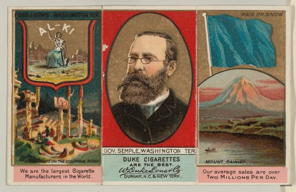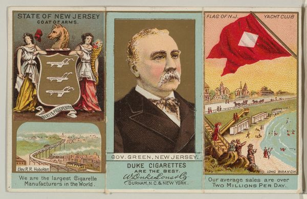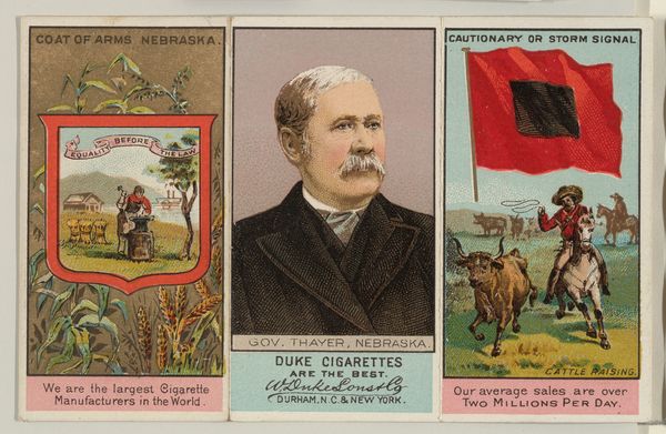 Curator: At the Metropolitan Museum of Art, we're looking at a print entitled "Governor McEnery, Louisiana, from 'Governors, Arms, Etc.' series," created between 1885 and 1892 by W. Duke, Sons & Co. It combines lithography with colored pencil. What's your immediate take? Editor: The juxtaposition of imagery feels inherently unbalanced. Governor McEnery appears rather staid, framed by scenes carrying distinctly different connotations and radiating very different emotional temperatures. Curator: Precisely! Look at how the Louisiana coat of arms featuring the pelican feeding its young, a powerful symbol of sacrifice and provision, is directly alongside a scene of sugarcane harvesting—likely depicting the labor of enslaved or recently freed people. The blatant advertising of "Duke Cigarettes" further complicates the narrative. Editor: Semiotically, the elements fight each other for dominance. The hard lines of the lithography attempt a clear statement, but the varying visual registers undermine a singular, coherent message. Is this intended to celebrate Louisiana, McEnery, or Duke cigarettes? The signifiers are a jumble. Curator: It certainly provides a fragmented and problematic depiction of the South. Note also the image of the Mississippi River—commerce, industry, yet shadowed by a complicated past of exploitation and forced labor. These commercial cards acted as miniature time capsules, revealing anxieties and aspirations of the time. Editor: And the choice of color contributes to the fractured reading experience. The muted tones of the governor's portrait contrast sharply with the bolder colors in the landscapes surrounding him. Curator: It's a potent mix of image and text, revealing both the promise and the deep moral ambiguities embedded in late 19th-century American capitalism. The symbols reveal uncomfortable truths if you care to decipher them. Editor: Indeed. Analyzing these deliberate artistic and structural decisions offers valuable lessons regarding intent and influence within historical works.