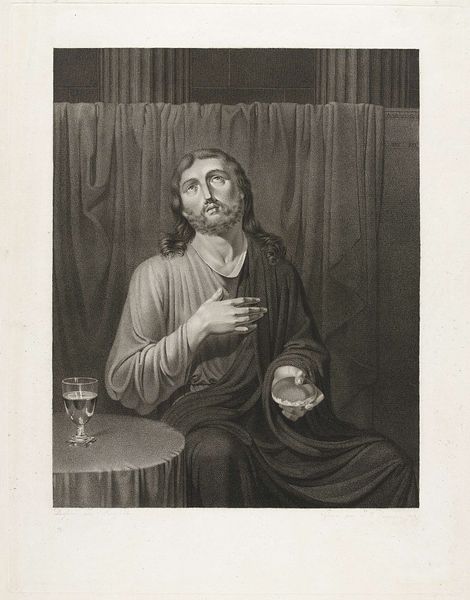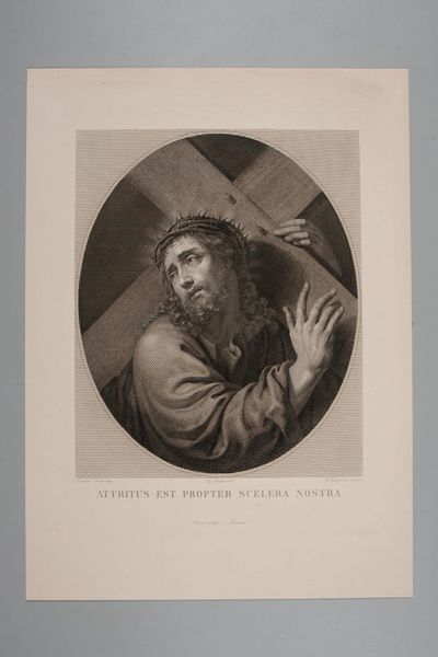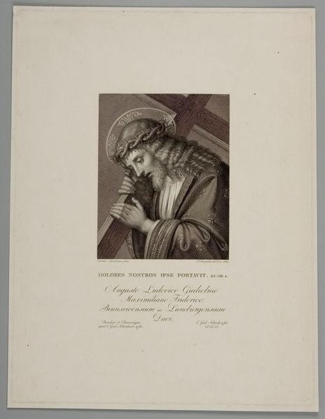 Curator: It has a solemn presence. The monochromatic rendering gives it a timeless feel, evoking a sense of deep reverence and contemplation. Editor: Let’s turn our attention to "Christus met het kruis," or Christ with the Cross, an engraving by Dirk Jurriaan Sluyter created after 1856. It's currently held here at the Rijksmuseum. The print depicts Christ bearing the cross, set against what appears to be an arched niche. Curator: Immediately, I am struck by the cross itself. You can almost feel the rough-hewn texture of the wood. Consider the sheer physical burden implied by the weight—you notice every knot, every splinter embedded in its timber. One thinks immediately of the physical labor. Editor: The composition emphasizes a poignant contrast, indeed. The figure is central and framed within the arch. See how the curve softly encloses and isolates Christ, almost drawing our eye to the emotional core. How do you perceive the lighting, given the medium of print? Curator: Note the meticulous cross-hatching of the lines, creating subtle gradients and shading, adding volume to the figure. He's weary but resolute. You can see it both in his lowered gaze but also in the set of his jaw. Also the engraver's work transforms cheap printed material into a carrier of intense personal reflection. Editor: Yes, Sluyter has rendered a strong interplay of shadow and light in a limited palette. Consider how that enhances the inherent drama. From a formalist standpoint, there’s also a delicate balance— the implied line of the cross echoes the arched frame, creating structural harmony despite the tension of the subject matter. Curator: And note the text above him – how it anchors the image to specific scriptural references from John XIX, thus connecting to a complex web of tradition, interpretation, and lived faith in a predominantly protestant, nineteenth century Dutch context. Its placement also shows the transition away from individualized artwork towards industrialized creation. Editor: Well observed! Thank you for elucidating both the material context and formal structure, enriching our appreciation of this print. Curator: It allows one to look through time. I appreciate how considering materiality invites us to consider labor and faith traditions intersecting in visual culture.