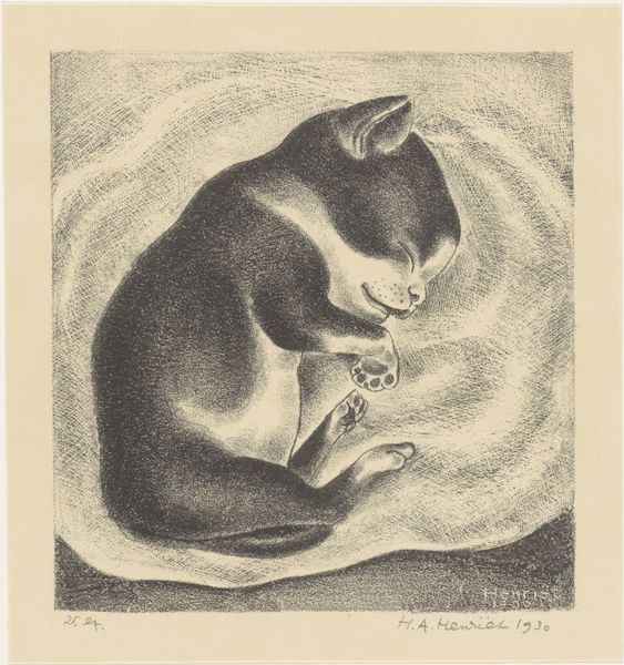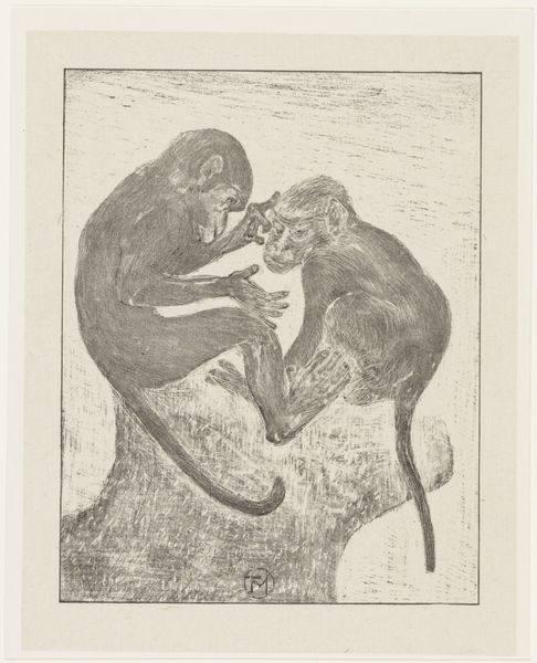 Editor: This drawing, "Fleaing Monkeys," from Heinrich Krabbé, likely done between 1878 and 1887, uses ink, pen, and pencil on paper. It feels incredibly intimate, capturing a quiet moment of grooming. What do you see in this piece? Curator: Primarily, I see a study in contrasts achieved through the artist’s masterful manipulation of line and tone. Note how the dense, cross-hatched lines define the form of the adult monkey, creating a sense of mass and weight. Editor: The hatching is so intricate, almost obsessive! Curator: Indeed. And observe how this contrasts with the smoother, more delicate lines used to depict the younger monkey. This difference in texture subtly emphasizes the relationship between the two figures and hierarchy. Notice also the background is just hatching and provides a flattening 2D space to contrast with the modeled and rounded apes. Editor: So it's the contrast itself that gives it power? Curator: Precisely! The strategic use of chiaroscuro—the interplay of light and shadow—further enhances the visual interest. The darker tones in the background and beneath the monkeys draw our eye to the highlighted areas, particularly the faces, thus heightening the emotional impact of the image. How do you interpret this visual vocabulary? Editor: I guess I see how focusing on form makes me think less about 'monkeys' and more about shape, line, and dark/light interactions, the tools available to the artist, and how they create contrast! Curator: Precisely. Focusing on the structural elements allows a deeper engagement with the artist's skill. I find that this heightened attention to the formal aspects of the drawing deepens my appreciation for Krabbé’s artistry. Editor: Me too. Seeing how much visual information is packed into these choices really makes the work stand out.
