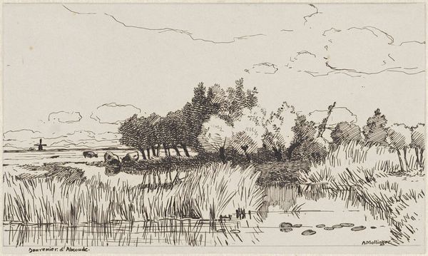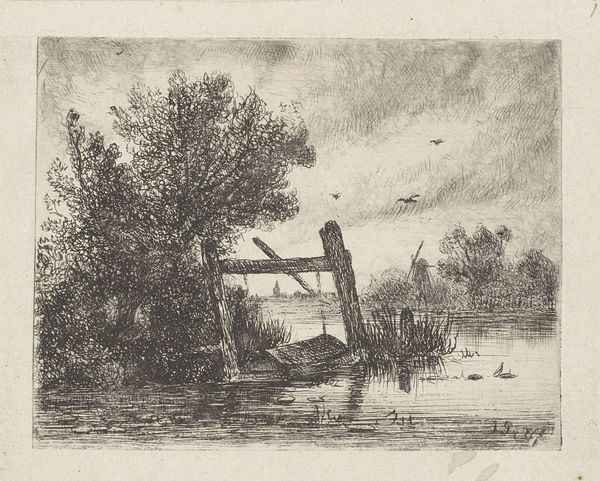 Editor: This is "Landschap met een man bij een roeiboot," or "Landscape with a man in a rowboat," an etching by Elias Stark, made sometime between 1859 and 1886. I find the scene quite serene, even with the stark black lines. The man seems very still. What stands out to you about this work? Curator: It's interesting that you call the lines 'stark,' given the artist's name. The subject here certainly resonates with a larger cultural fascination in 19th-century Europe: a desire to connect with nature and a sense of quiet solitude. Where do you think such fascination comes from? Editor: Maybe it was a reaction to the growing industrialization, a sort of pastoral fantasy? Curator: Precisely! And note the availability and increasing affordability of printmaking. The etching process, with its ability to create multiples, allowed artists like Stark to distribute these idyllic scenes widely, shaping a public perception of the landscape as a retreat from the anxieties of modern life. Look closely - what details do you think most strongly evoked the sensation of 'rural escape' for viewers at that time? Editor: I think it’s the scale and composition – such a vast sky, open water, and the figure almost disappearing into nature. This smallness probably captured the sublime effect they sought. Curator: That’s astute. It encouraged viewers, whether buying art or not, to consider art’s public role to define the politics of landscape, linking social well-being to visual expression and nature's beauty. Editor: So the piece's value lies in illustrating the socio-political thinking of the time more than portraying the landscape itself. I'll remember that for my upcoming assignment. Curator: It’s in the blend of the two – social trends shape how people interact with the land and reflect on its essence in artistic practices.