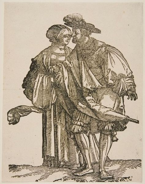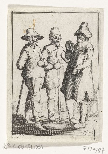 Editor: This is Pieter Jansz. Quast's "Two Men Leaning on a Stick." It’s a compelling image because of the stark lines and the textures created by the etching. How do you interpret the relationship between line, form, and content here? Curator: The power of this image resides in its very formal simplicity. Notice how Quast uses varied line weights and hatching to articulate the figures’ forms and ragged clothing, creating a visually arresting contrast between light and shadow. Editor: So, it's the technical skill in the etching that truly defines the piece? Curator: Precisely. The formal elements – line, texture, and composition – communicate a sense of destitution and resilience more powerfully than any narrative could. It compels us to look closely at the execution. Editor: That gives me a fresh perspective on appreciating the artist’s technique! Curator: Indeed. By focusing on these formal aspects, we perceive the artistry with greater sensitivity.