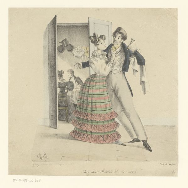 Curator: Good day, I'm here to illuminate our current piece, a drawing by John Leech called "Conductor, 'Now Marm! Wait-Chapel or Mile Hend-only a.'" Editor: The drawing has this delicious energy to it, all bustling and cheek. My eye immediately goes to the conductor with his limbs all akimbo and exaggerated eagerness. Curator: Absolutely! Leech was a master of capturing social satire. He employs ink and pencil on paper to construct a scene brimming with everyday life in Victorian England, that captures the nuances of class and commerce with a playful touch. The light washes of color add to its charm. Editor: There’s an overt semiotic at play. The repetition of visual components such as hats, figures compressed with implied crowding, and text indicating economic messaging is overt and can hardly be missed. It feels so performative, doesn't it? Almost stage-like. The phrase, the body language, all scream of a need for social leverage that reflects something about modern economics at the time. Curator: Precisely. The use of caricature here exaggerates the stereotypes – the flustered matron, the eager conductor, the faceless crowd in the background – creating a vibrant social commentary. It's all so cleverly orchestrated. The drawing doesn't merely show us a scene; it tells us a story, full of gentle irony and humour. Editor: But what a story. A penny's ride to who-knows-where? To me, this isn't simply a city scene—it's more a symbolic snapshot of the modern person in industrial Britain; eager but probably disenfranchised; the title reads almost as a taunt against our contemporary world. Curator: Indeed, I am now reminded of how art acts as a mirror reflecting cultural attitudes and, at the same time, perhaps inviting critique, wouldn’t you agree? Editor: Totally. Looking at Leech's work just reaffirms art's enduring power. And hopefully its ability to keep us on our toes.