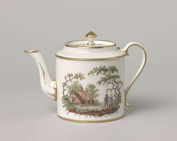 This milk jug, with its hand-painted landscape, was made by the Koninklijke Porseleinfabriek Dommer. The jug is made of porcelain, a material prized for its smooth, white surface and ability to take on delicate forms. The landscape decoration, rendered in colorful enamels, speaks to the tradition of picturesque scenes in the decorative arts. Note the way the gold trim accentuates the jug's shape, adding a touch of luxury. But let’s consider the social context. Porcelain production was a highly skilled, labor-intensive process. Factories like Dommer employed many workers, who were each experts in different stages of ceramic production, from molding to painting. The jug can be appreciated as an object of beauty, but also as a product of collective labor. Paying attention to the materials and making process, helps us to understand how the jug connects to broader issues of class and consumption in Dutch society.