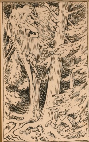 Arthur Rackham made this drawing of The Wolf and the Crane with ink in 1912, and what I love about ink drawings is that you can see every decision the artist made, right there on the page. There's so much life in the marks themselves. Look at the wolf's fur, it's all these quick, scratchy lines that give it a real sense of texture and movement, and the way Rackham uses line weight to create depth and shadow makes it seem so solid and present. The crane's feathers, made with long lines and curves, are a study in contrast. Rackham reminds me of Edward Gorey, who uses those meticulous details to bring the world to life, and also makes you wonder, what is the world really like? The process of looking at it this closely makes you ask questions about what you see.