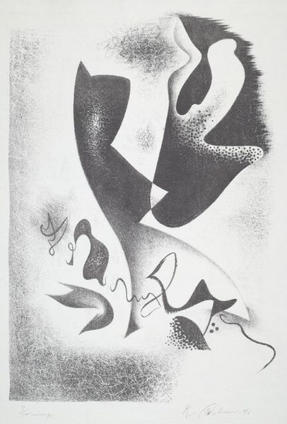 Ray Kaiser made this untitled abstract print using ink on paper. Right away, what grabs me is the pure joy in mark-making. She’s not trying to trick you into thinking it’s anything other than ink on paper, and that’s the magic. Look at the different textures she’s conjured, from the dense, almost woven quality of some areas to the looser, more gestural strokes elsewhere. The stark contrast between black and white heightens the graphic punch. There's an ambiguity which keeps the eye roving around the whole composition, asking what are these things and how do they relate to each other? Take that patch of tightly packed dots on what could be a leg. It’s almost vibrating with energy, a tiny universe of its own, set against the flowing lines around it. This piece, with its playful ambiguity and embrace of process, reminds me a little of some of the later work of Philip Guston, who also wasn’t afraid to let his hand, and his sense of humor, guide the way.