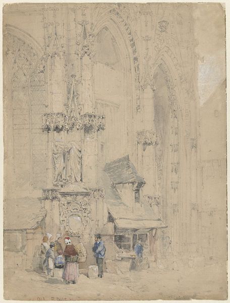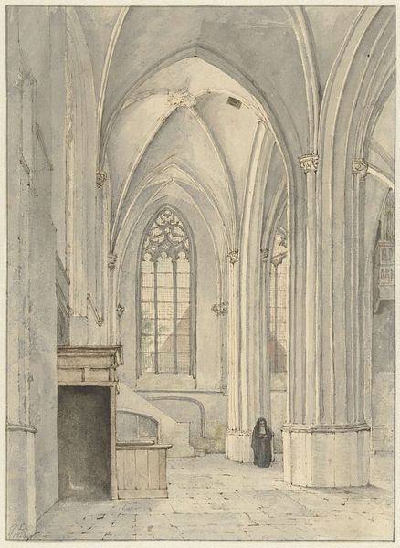 Curator: Looking at this, the overwhelming impression is of space, distance and tranquility, all achieved through Bosboom’s delicate layering of tones and hues. Editor: Indeed. Here we have "Interior of the Nieuwe Kerk in Delft," a drawing by Johannes Bosboom completed in 1839. Bosboom was part of a generation of Dutch artists who turned inward, focusing on domestic scenes and architectural studies. Consider how Dutch identity was being reimagined after the Napoleonic era. Curator: Yes, this interior is fascinating. Note how the eye is immediately drawn upward, following the towering columns toward the high arches. Bosboom guides our gaze meticulously through his use of light and shadow, almost like a musical composition. Editor: Certainly. But it is the figures populating the space, a woman praying and a group conversing in period garb, that ground the divine space, hinting to class structures within the church and therefore the society of the Netherlands in the early 19th century. Curator: They contribute to the sense of scale, highlighting the overwhelming verticality, creating the architectural perspective, though their arrangement certainly conveys aspects of the space in use. I keep being drawn to the tonality of the grey and white in the drawing. Editor: It also calls into question the Church’s diminishing temporal power following French occupation in contrast to the visual representation. This invites discussion of what is made visible, and also what the Church would rather keep concealed during the early 19th century. Curator: Agreed. Looking closer, you notice the meticulous detail given to the architectural elements contrasting the muted, almost ghostlike quality of the people, creating a compelling juxtaposition of structure versus transience. It draws the observer to examine not just the lines but the emotional tenor, where both the individual and structural converge. Editor: By portraying this interior, Bosboom situates the church not just as a monument but as an arena shaped by societal pressures, opening it to critical dialogue around power, faith, and its spatial consequences. Thank you for considering this perspective with me! Curator: Thank you, those sociopolitical angles definitely cast a different, deeper shade across Bosboom's light.