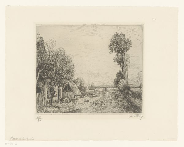 Curator: This is "Zittende naakte vrouw in landschap," or "Seated Nude Woman in Landscape," an etching by Ker Xavier Roussel, created sometime between 1920 and 1935. Editor: Oh, it has such a melancholic air to it! The stark black and white contrasts create this really contemplative, almost dreamlike scene. Is she lonely, or just... at peace? Curator: Roussel often explored idyllic scenes, and this work reflects a broader trend of revisiting classical themes within modernism. There’s a real tension here between the figure's naturalism and the rather abstracted landscape around her. Think about how often we view female nudes through the lens of classical mythology. What happens when we place this classically-inspired figure in what otherwise seems like a pretty ordinary, quiet spot? Editor: It’s almost voyeuristic, isn’t it? Like we've stumbled upon her private moment of reflection. The etching technique, with all its intricate lines, lends a vulnerability, as if revealing secrets etched into the very fabric of the world. There is also a question of gender at stake; did Roussel want the observer to see women's bodies in landscapes, in peace with Nature? Curator: The social and art historical currents inform my reading: post-war anxieties perhaps projected onto the female form. This print also invites considering who might be purchasing these images and to what effect? But what draws me to Roussel, beyond that analytical lens, is the evocation of these deeper, quieter narratives. Editor: Agreed. This is more than a mere nude in a landscape; it’s an invitation to sit alongside her and consider your place in it. Even without bright color and detail, a profound intimacy remains. Curator: It’s a potent image, that continues to resonate, raising questions about perception, vulnerability, and the quiet beauty of solitude. Editor: Yes, that space between the subject, and the natural surrounding is where its emotive power grows, doesn’t it?