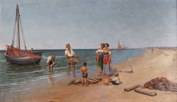 Rupert Bunny painted "On the beach (Royan)" with oil, layering sandy yellows and hazy blues. What strikes me is the way Bunny uses the paint almost like memory itself – soft, a bit blurry, capturing a feeling more than a photographic reality. Look at the seated figure reading her book, notice how the white dress seems to blend with the sand, making her almost one with the beach. The brushwork around her is loose, scumbled, and broken up, suggesting the shifting nature of light and the ephemeral quality of a summer afternoon. It's not about capturing every detail, but about conveying the overall sensory experience. This reminds me a little of Bonnard, who was also interested in capturing intimate, domestic scenes with a similar hazy light and focus on the emotional atmosphere. Bunny’s painting invites us to slow down, breathe in the salty air, and get lost in the dreamy atmosphere.