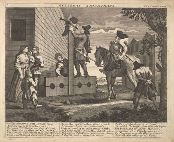 Curator: Ah, this is “Sir Hudibras His Passing Worth the Manner How He Sallyed Forth," a print by William Hogarth, created sometime between 1725 and 1730. It's an engraving, currently held at the Metropolitan Museum of Art. What do you make of it at first glance? Editor: My initial thought? Don Quixote meets a particularly scruffy dog walker. The lines are so precise, but there's a real looseness in the composition that hints at some satirical narrative unfolding. Curator: Absolutely! Hogarth was a master of visual storytelling. This piece is actually one in a series illustrating Samuel Butler’s satirical poem, “Hudibras." It mocks the English Puritans, specifically targeting their perceived hypocrisy. Editor: Okay, the high hats make more sense now— definitely Puritanical garb. Look at the figures: The dog practically leaps off the page. Hogarth uses line and form so purposefully— there's an implicit hierarchy to the characters based on their position and clarity, it seems. And you can read something in their faces: fear? Resignation? Disgust? Curator: Precisely. The titular character, Sir Hudibras, atop his horse, appears pompous and self-important, but if you read Butler's verses that accompany the image it challenges these figures and pokes fun at misguided adventures and inflated egos of this time period in England. Editor: This feels particularly relevant, doesn't it? Even now there are real parallels to contemporary political discourse, those loud voices and empty promises persist today. Curator: Yes, the poem itself satirizes religious zealotry, which Hogarth amplifies visually through the men’s absurd outfits and expressions. It feels so current even three centuries later! And beyond the satirical jabs, there is a beauty in the details and it invites contemplation and even a sense of humor that goes beyond pure polemic. Editor: Absolutely. Seeing this work underscores the importance of art that dares to question and subvert. Hogarth, through his wit, helps us dissect societal structures and assumptions, then and now. Curator: Hogarth makes one really sit with uncomfortable truths about humanity—we can so easily succumb to self-righteousness. A little introspection goes a long way. Editor: Indeed. Hogarth makes us aware that power unchecked, then or now, invites absurdity— and it needs art to reveal that.