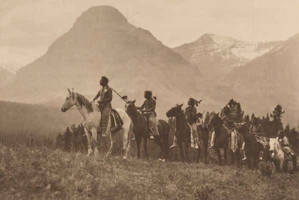 Editor: This is Edward S. Curtis's "Desert Rovers - Apache," a print photograph from 1903, held at the Art Institute of Chicago. The photograph portrays a group of Apache men on horseback, and the sepia tones give the scene a solemn and reflective quality. How do you interpret this work in terms of its historical and social context? Curator: The image appears as a straightforward portrait of a small group, but what Curtis presents us with is rife with the complicated and unethical power dynamics of representation. These images, while seemingly offering a glimpse into Native life, are deeply implicated in a history of colonial erasure. Curtis, like many photographers of his time, actively constructed an image of the “vanishing race,” furthering a narrative that justified dispossession and assimilation. Editor: So, what you are saying is, his work contributed to a narrative that disempowered the very people he photographed? Curator: Exactly. It’s crucial to understand that Curtis wasn’t simply documenting; he was participating in the construction of a particular, and damaging, narrative. Notice how the landscape, while physically present, seems almost secondary to the figures. This visual hierarchy mirrors the broader societal devaluation of Indigenous land rights and sovereignty. What do you make of their expressions and attire? Do you feel they offer a window into individual agency, or do they seem mediated by Curtis’s vision? Editor: It's difficult to say. There is a stoicism to their posture and dress that seems intended to convey a particular kind of "native" identity, now that you mention it, seemingly crafted for an outside viewer rather than being entirely self-determined. This makes the photo less of a representation and more of a statement on the colonizers part, one could say. Curator: Precisely. Recognizing Curtis's photographs as constructed narratives is crucial to engaging with them critically. We should ask ourselves: Whose story are we really seeing? And how can we be more attentive to the voices and perspectives that have been historically marginalized and even actively silenced? Editor: I’m beginning to understand how much the social context impacts how we view this photograph, making us more critical towards historical narratives and colonial representations. Curator: Indeed. This kind of questioning of the visual record can equip us to become more thoughtful consumers and critics of visual information overall.