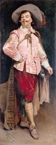 James Tissot created "Le Deuxième Comédien" with oil on canvas. The immediate impression is one of studied elegance, with a focus on texture and costume. The actor's fur-trimmed robe dominates the composition through its dark mass, contrasting sharply with the pale textures of his face and clothing. Tissot’s choice of subject reflects an interest in the theater. However, the actor’s contemplative pose and the stack of books he carries suggest a more profound engagement with intellectual life. This contrasts with the traditional view of actors as mere performers. The dark background and subdued palette emphasize the tactile qualities of the fabrics, drawing attention to the materiality of the painting itself. Here, Tissot destabilizes the conventional hierarchy between subject and presentation. By highlighting the construction of the image, Tissot invites us to consider how meaning is produced through the act of representation. This painting is more than just a portrait. It's a statement on the performative nature of identity.