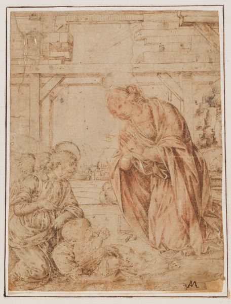 Curator: So, what strikes you about this drawing, this reddish-brown chalk, pen, and pencil rendering? Editor: Oh, it's immediate: chaotic warmth. Like peeking into someone’s intensely personal family moment, softened by history, nostalgia... dust motes of the Renaissance! It feels incredibly intimate. Curator: Absolutely. The Art Institute of Chicago holds this study, "Madonna and Child with Saints Elizabeth and John the Baptist," created after 1606 by Annibale Carracci. It exemplifies a High Renaissance interest in dynamic compositions. Editor: Dynamic is right! Those chubby babies are ALL elbows and knees and grabby little hands. It’s not some static, posed devotion. There's an almost…domestic squabble energy? Curator: That's Carracci's skill – infusing classical themes with relatable humanity. Consider the historical context: Renaissance artists frequently secured commissions from wealthy families seeking portrayals reflecting their ideals and aspirations. Carracci infuses this established demand with accessible emotional depth, reflecting new spiritual ideologies from Counter-Reformation Italy. Editor: Right. And that loose style of hatching; look closely –it adds to that unvarnished quality. The contrast between the sharp, sure lines defining Mary’s face, then those scribbled-in areas around the figures... Almost as if the energy is too much to contain with exactness. It breaks free! Curator: The medium underscores your point, really. Drawing permitted exploration of preliminary ideas and facilitated artistic freedom, unlike monumental artworks such as altarpieces that often demand a far more rigorous and politically sensitive approach. Editor: Well said. To me it seems like there are so many underlying emotions swirling within this familial scene: Protection. Playfulness. Irreverence, even? It's a world away from some gold-leafed icon. Curator: Which speaks to the shifting values of the era, and art’s role in that shift. The public was primed for more personalized engagement. Editor: That rings true. Spending time with this study just reinforces my belief that, at its best, art makes grand stories intimately and viscerally ours. Curator: Yes. And it allows us, centuries later, to recognize familiar patterns of behavior across epochs and appreciate them within changing socio-cultural contexts. Editor: Beautifully put. Makes me want to run home and just...hug my loved ones! Imperfect, maybe even squabbly, but all the more precious.