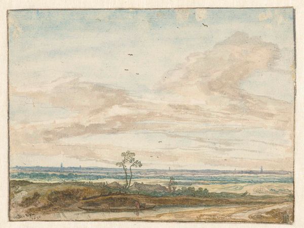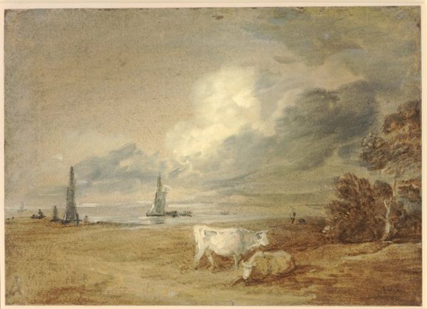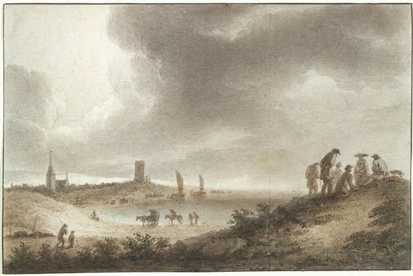 Editor: So this is Jurriaan Andriessen’s “De Baak, een badplaats aan het IJ,” or "The Beacon, a bathing place on the IJ", made in 1803 using watercolor. The colours are muted, the sky vast, and it really evokes a sense of everyday life by the water, with these figures wading in. What symbols or cultural touchstones stand out to you in this piece? Curator: The overcast sky dominates, almost pressing down on the scene. The grey is heavy, almost foreboding, while the people appear carefree. Note how the beacon, usually a symbol of guidance and safety, seems diminutive. Consider how the presence of figures in a landscape – particularly nude ones in the tradition of Romanticism – is often intended to contrast raw, idealized humanity with sublime nature. Do these figures suggest harmony or perhaps vulnerability to the natural elements in this environment? Editor: That's an interesting way to put it. It's like they are dwarfed by the vastness. Does that have anything to do with the changing attitudes towards nature at the time? Curator: Precisely. As society changed, so did people's understanding of nature's symbolic meanings and emotional implications. As a site for cultural interaction, a landscape can suggest everything from freedom and leisure to an uneasy or ambivalent response to our changing environment. Notice also how the distant ships on the horizon speak to trade and travel – a silent but powerful visual element from that period. Editor: So the clouds and open water are not just aesthetic, but they're carrying some weight here. Thank you, I will definately keep these historical contexts in mind when observing artworks in the future. Curator: Indeed, a painting’s lasting value may be precisely that conversation it creates with people across generations, using visual shorthand to ask: Where do we locate ourselves within an environment and its collective symbols?
