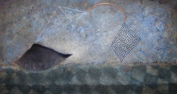 Editor: Lech Jankowski's "La Notte," created in 2016 with oil paint, presents a really dark and intriguing atmosphere. It feels vast, and a bit ominous, almost like looking into a deep, unknown space. How do you interpret this work? Curator: It’s interesting you mention the feeling of the unknown. Consider how the title, "La Notte" - The Night - frames our understanding. The artist’s choice to use abstraction removes specific narratives. However, that almost cavernous darkness becomes a kind of stage. A stage for what, exactly? Think about the time in which this was painted – 2016. What societal anxieties might this reflect? Editor: I guess a lot was going on in 2016 politically... elections, global instability. Could this darkness symbolize those anxieties? Curator: Precisely. The two shapes at the top could be interpreted as watchful eyes or even distant planets, creating a sense of being observed. The lines at the bottom... are they prison bars? Are they shafts of light? Perhaps the painting’s strength is in its ambiguity. Editor: I didn't even think of the shapes at the top as eyes, but I can definitely see it. The ambiguity makes it hard to pin down one meaning. Is that intentional on the artist’s part, do you think? Curator: Very possibly. By offering few concrete clues, Jankowski invites the viewer to project their own feelings and fears onto the work. Think about the institution of the museum itself: Does the sterile white wall amplify or dampen that feeling of anxiety that we're talking about? Editor: It's almost like the museum becomes a safe space to contemplate something unsettling. Curator: Exactly! It provides a space to examine complex issues that society might find difficult otherwise. I appreciate how your reading helps contextualize this painting. Editor: I’ve never really considered how the surrounding environment influences my understanding, so thank you!