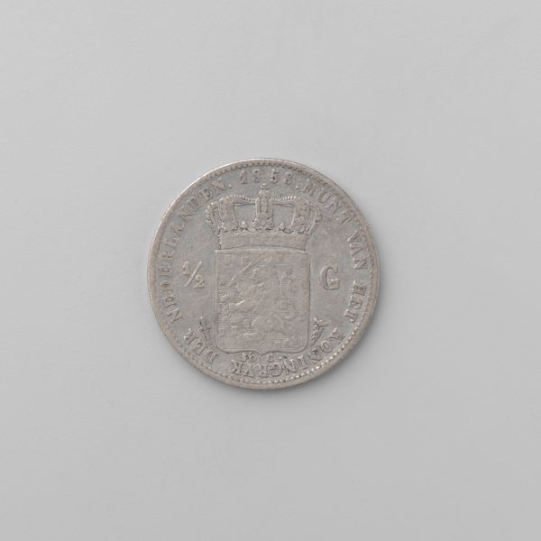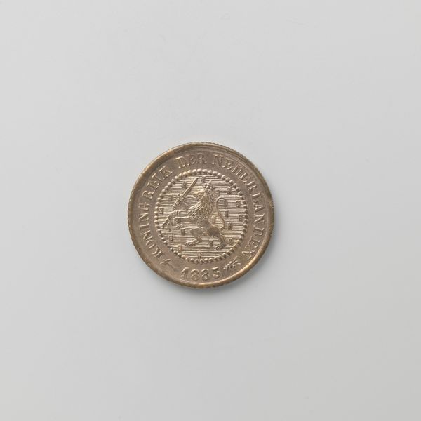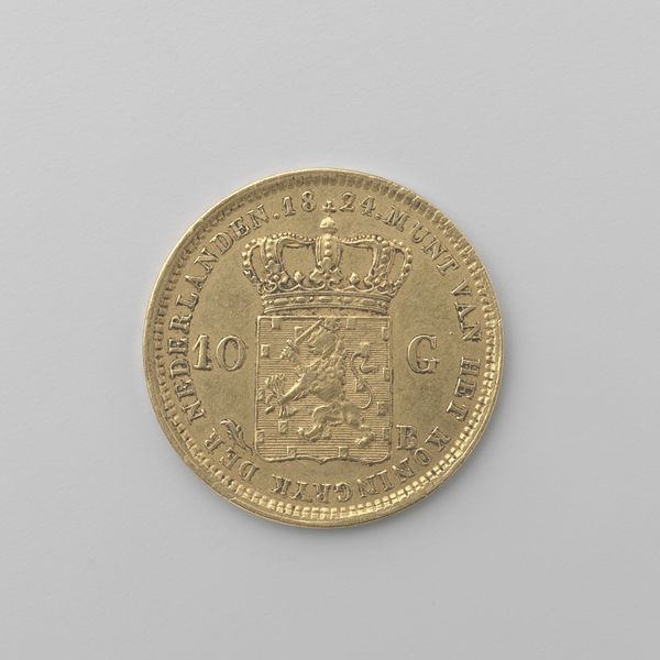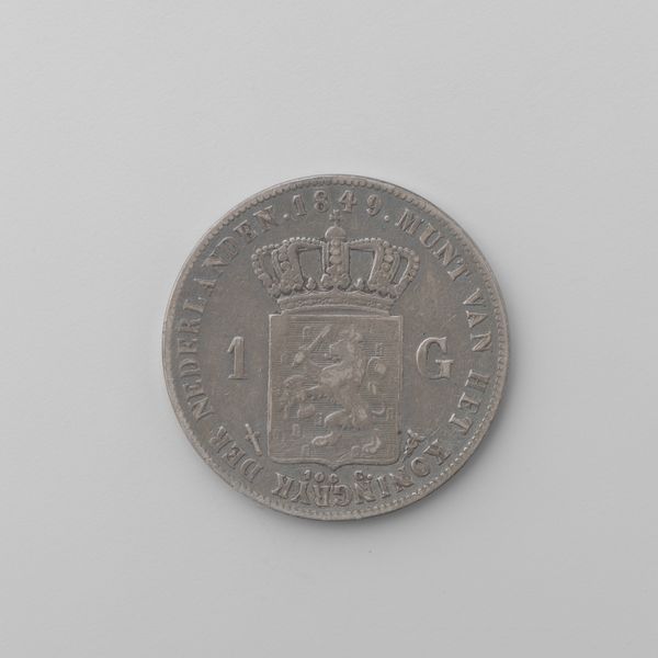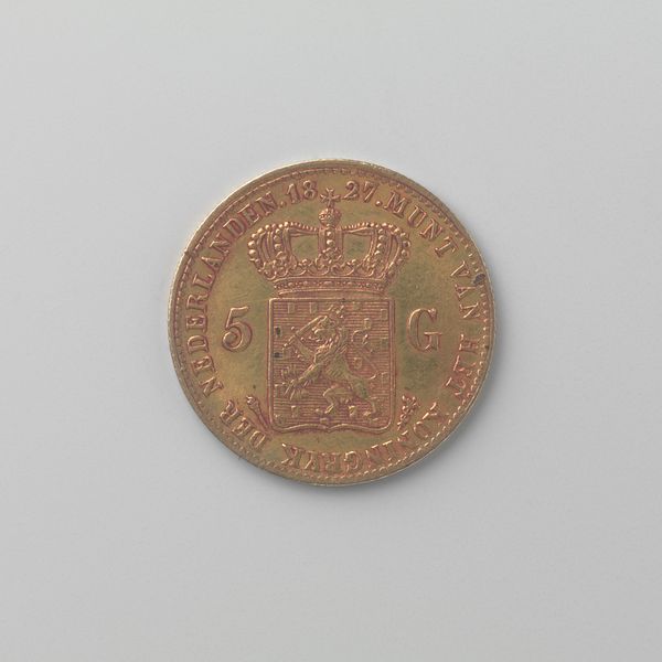 This is a Dutch 5 Gulden coin from 1826, designed during the reign of Willem I. Its small scale belies its symbolic weight. The circular form, a common feature for currency, immediately suggests notions of unity and unending value. The coin's surface is divided into two distinct zones: the central heraldic emblem featuring a crowned shield with a lion, and the surrounding inscription. This division highlights a hierarchy, where the symbol of royal authority is framed by the text legitimizing its power. The lion rampant, a traditional symbol of the Netherlands, is meticulously rendered within the shield, its posture and the crown above underscoring themes of strength and sovereignty. The inscription in Dutch serves not just as a label but as a continuous loop of affirmation, embedding the coin within a network of language, identity, and economic exchange. Observe how the coin's design operates as a microcosm of the kingdom itself, compressing complex systems of governance, representation, and value into a portable, tactile object.
