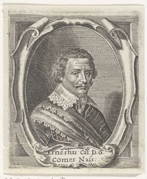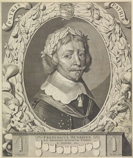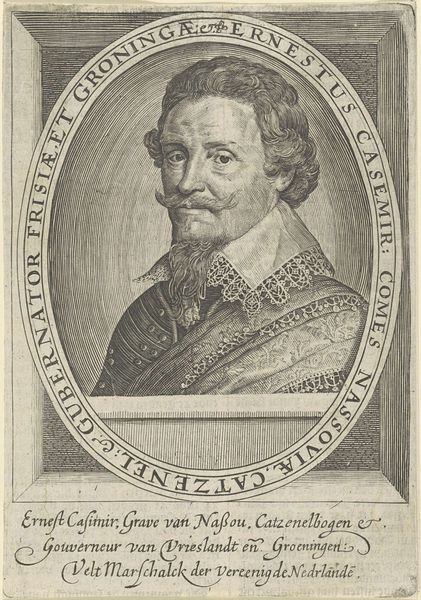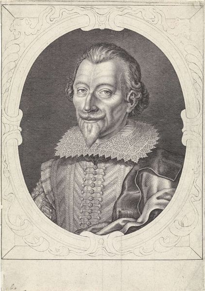 Curator: We're looking at "Portret van Witte Cornelisz. de With", a print created between 1637 and 1641. It's attributed to Theodor Matham and currently resides in the Rijksmuseum. Editor: It has a starkness to it, doesn't it? The tight focus, the monochrome engraving... almost severe, but also very distinguished. A sense of quiet authority emanates. Curator: Indeed. This is characteristic of the Dutch Golden Age, an era marked by immense mercantile success and a burgeoning sense of national identity. Witte Cornelisz. de With was, as the inscription proclaims, Vice-Admiral of Holland and West Friesland, a powerful figure in the Dutch navy. Editor: You can definitely see that power reflected in his gaze. His garments—the lace collar, the ornamental chain—all communicate status, reinforcing that the political context and Dutch power during this era allowed De With access to resources. But, even though the inscription praises his patriotism and courage, it’s difficult to overlook the role slavery played in Dutch colonial profits. Curator: That's a vital point to raise. While this image ostensibly celebrates a national hero, it’s important to acknowledge the systemic inequalities woven into the very fabric of that era, including Dutch involvement in the transatlantic slave trade. Engravings like these played a part in constructing public image. Editor: Exactly! The accompanying text reinforces this constructed image. It tells us he faces adversity unflinchingly, fights for his fatherland with unwavering zeal. These words and visual cues were incredibly potent, bolstering social hierarchies. Curator: Yes, Matham employs classic Baroque elements. The oval frame, the dramatic lighting creating stark contrast, and the inscription contribute to that era's emphasis on capturing powerful and imposing figures. This artistic approach elevated De With’s status. Editor: It makes you wonder how many narratives are obscured or outright erased to construct a single story of national triumph and powerful leaders, narratives about marginalized groups. Curator: Absolutely. These images served as both a visual record and a political instrument. Editor: Looking at this portrait now, it really shows how art from any era reflects a society's values. Understanding this print, requires us to unpack complex narratives and engage critically with the historical forces shaping its creation. Curator: I think that’s why museums like this, constantly strive to reinterpret the context, and ask more pertinent questions about history.