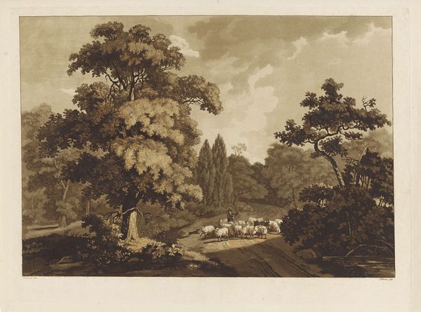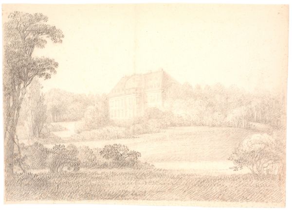 This work by J.P. Møller, currently at the SMK, presents several closely situated buildings, including a main structure and smaller houses with chimneys, set alongside a body of water and surrounded by trees and hills. The overall composition employs a subdued palette to evoke a contemplative mood, achieved through meticulous detail and a structured arrangement. The buildings and natural elements are rendered with precision, inviting the viewer to explore the interplay between constructed forms and nature. The use of line and shading creates depth and form, emphasizing the architectural details and the landscape's undulations. The artwork balances these visual elements, drawing attention to the detailed rendering of architectural and natural forms. These function together, connecting us to the world through a structured and detailed representation.
