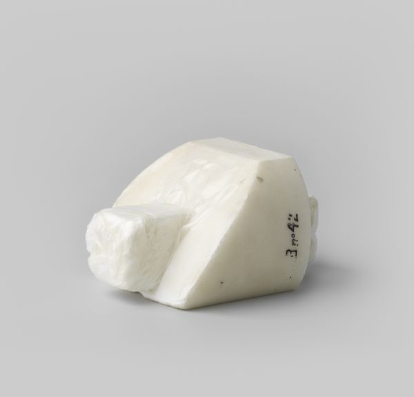 Curator: This intriguing piece is called "Kussen van t\u00eate-\u00e0-t\u00eate," made between 1775 and 1778 by the Kaiserliche Porzellanmanufaktur. It's crafted from porcelain, presented in a still-life photographic style. What are your initial thoughts? Editor: Well, honestly? It reminds me of a misshapen biscuit! A sort of lumpy, ancient cream-colored confection. There's a tactile quality to it even in this image... Makes you want to poke it to see if it’s hard or soft. Curator: That tactile quality is key. This porcelain "Kussen" or cushion, was intended as decorative art during the Rococo period. It suggests leisure, intimacy, and a certain delicate sensibility. The Rococo was very much about performative femininity within aristocratic circles, you see, so there are many layers about who had time and luxury for items like this. Editor: Right, objects speak volumes about social hierarchy! The delicate Rococo aesthetic, the labor involved in crafting porcelain...It whispers of an exclusive lifestyle far removed from, well, actual hard labor. And let’s be honest: a porcelain cushion? The irony drips, doesn't it? Curator: Indeed. Consider, too, the phrase "t\u00eate-\u00e0-t\u00eate," which speaks to private, intimate conversations, traditionally a space of negotiation and power dynamics within societal structures. This porcelain cushion becomes not just a pretty thing but an artifact imbued with questions of gender roles, power and exclusivity. Editor: Hmm, that intimate sphere you describe is ripe with potential for mischief and clandestine negotiations... This unassuming cushion now feels heavier somehow, weighed down by implications! It has transitioned, for me, from quirky object to loaded signifier. Curator: Exactly. It invites us to examine how the aesthetic object intersects with broader narratives of societal expectations, class and even gender. Editor: From cream puff to critical discourse in two minutes flat! This artwork really does open doors to unexpected interpretations, doesn't it? Curator: Precisely; I find I walk away reflecting not just on the aesthetics of the era, but the latent statements they can reveal about society.