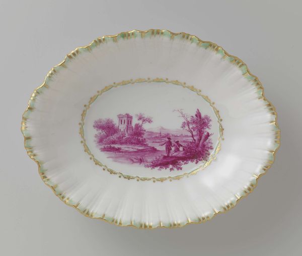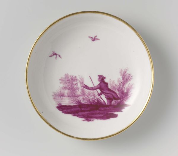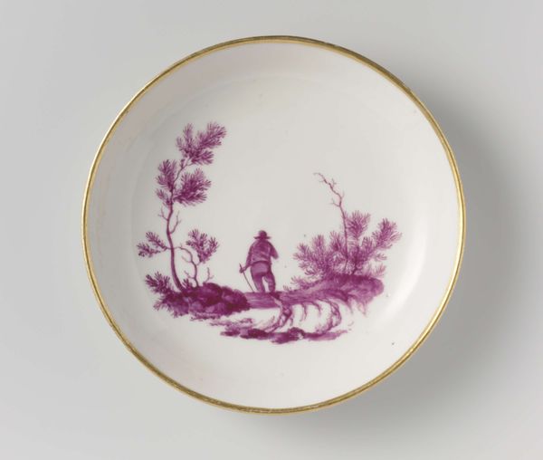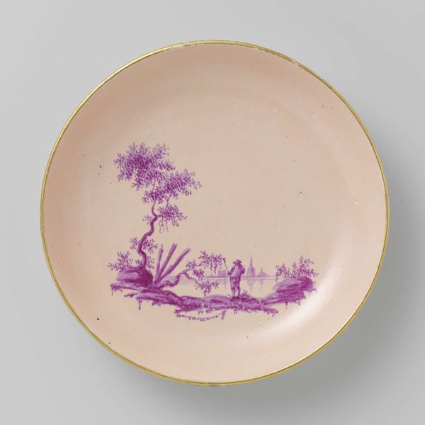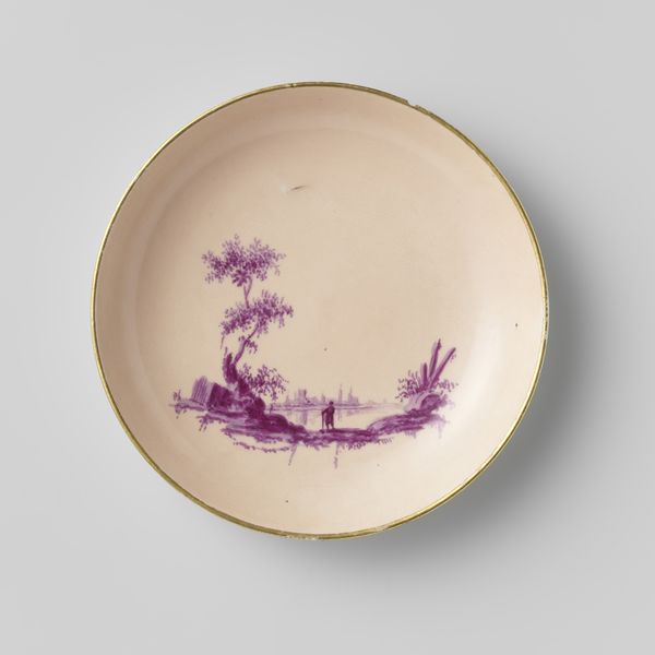 Curator: Ah, Wedgwood. Looking at this c. 1820 porcelain plate, I’m instantly transported – it’s not just a plate, it's a little lavender dreamscape. Editor: Indeed, quite arresting. The restrained palette, primarily whites and a sort of monochrome mauve… It gives the landscape a very ethereal quality. Like a memory. Curator: Precisely! Like looking back through the mists of time, a nostalgic haze. What do you make of the composition? Editor: Formally speaking, the image sits well within the confines of the circular shape. The painter’s use of varying tones creates a subtle depth; it almost echoes Chinese porcelain painting, but within a clearly Western picturesque tradition. And that delicate gold rim lends a refined touch, separating the artistic rendition from the everyday. Curator: You know, I often wonder about who was eating off this. What stories this plate could tell if it could talk, it must have some tales to tell! Editor: If anything it strikes me as a sentimental and somewhat fragile, like the society it was made for. The idealization of nature is obvious, yet rendered here with a certain almost haunting simplicity, more as symbolic reference than actual representation of nature. Curator: Symbolic, yes – like a carefully chosen emblem of the owner's refinement, but still deeply rooted in appreciating beauty. Makes you wonder about their vision of ideal life doesn't it? I’d love to sit and daydream in that world. Editor: Certainly, each carefully constructed line invites one to reflect on art's potential for emotional storytelling. I'm intrigued to understand what makes you associate beauty so strongly with idealized landscapes. Curator: Because within these artful depictions lies a unique vision of our connection with environment. Editor: Perhaps this piece suggests how we project our hopes and fears onto something external and permanent, such as a plate?