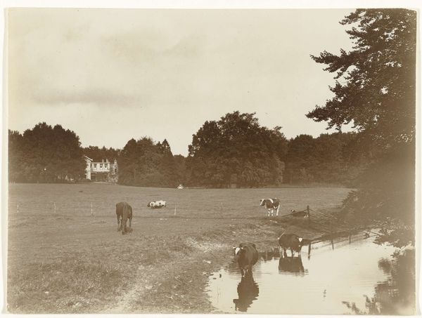 Curator: This photograph presents a landscape scene with dwellings amidst dramatic rock formations, taken in 1901. It's titled "Huizen bij rotsformaties in Huelgoat" – "Houses by Rock Formations in Huelgoat." Editor: It feels timeless, almost mythical. The sepia tones give it a feeling of faded memory. Are we looking at an illustration or a vintage print? The rocks dominate, with just glimpses of structures peeking through. Curator: It is a photograph employing the Pictorialist style, aiming for an artistic effect achieved through darkroom manipulation. Pictorialism used techniques like soft focus to elevate photography to the level of painting. Notice how the soft light washes over the composition. It blurs the distinction between reality and imagination. Editor: Indeed. The houses are reduced to simple geometric shapes, almost blending into the geological backdrop. Is this a comment on humanity's relationship with nature? Does one belong to the other? How might society consider how buildings are being designed into such landscape? Curator: It might reflect the symbolic power of natural settings within the cultural memory of a place. For instance, boulders have frequently been read as archetypes of resilience and the lasting presence of something old. A house tucked beneath rocks perhaps symbolized a specific, humble relationship to nature's power, a seeking of protection rather than confrontation. Editor: The choice to obscure sharp detail encourages the viewer to contemplate a deeper sense of place. It suggests a society intimately bound to its physical environment, almost enveloped. There's something melancholic in this fusion; as though the modern world has encroached but not yet fully consumed this way of living. What happens with our need to shelter under something grand like a mountain or beneath boulders in the distant future? Curator: Exactly, these rock formations were important locations and shelters, and likely became symbolic. To further that connection, Pictorialism helped to cement Photography’s ability to act as a time capsule, or cultural memory. What looks to be an objective image now contains powerful metaphors. Editor: It shows how an artist could use early photographic processes not just to record but also interpret and even mythologize. I find myself reflecting on the way landscapes shape our understanding of identity. Curator: And I how enduring motifs transform over centuries of collective symbolic experience. Editor: A lasting reminder, for me, that every visual, irrespective of media, is first and foremost, a symbolic statement.