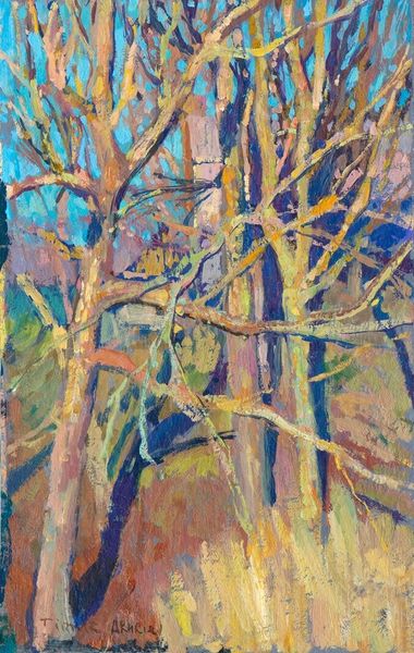 Curator: Gazing at this work, I’m instantly transported to some secluded, almost mythical grove. It's an escape into an interior landscape, wouldn't you say? Editor: Absolutely! It's like stepping into a dream…a blue-green dream, maybe slightly melancholic. It’s hard to put my finger on exactly why, but it does resonate with a deep, quiet sense of solitude. Curator: I find it so fascinating how Henderson used acrylics to evoke such depth and movement in "Tree No.6," created back in 2004. It’s classified as expressionist but seems to pull from many streams. Did the title catch your eye at all? Editor: It's very…minimal, wouldn't you say? Considering the painterly chaos happening on the canvas? One might think this 'number six' could refer to the sixth tree in the forest—a significant spot where secret meetings occur. Curator: Hah! A secret rendezvous! It could be! These colors... there's a lot of cool greens and blues, yet Henderson throws in these hot lines of reds to keep us on our toes. A very particular choice of using line I suspect. Almost arbitrary lines. Editor: True. And observe the figure near the water...almost obscured. Is it just me or do their clothes invoke feelings of traditional labourer class dress wear? And look how the tree seems to almost offer the person into a space between the trunks! Symbolically loaded. Curator: Perhaps that isolated figure is Henderson himself, retreating into nature's embrace. Do you think the expressionist style is used to mask realism? Editor: Perhaps not to mask—I don’t want to go too Freudian on the work— but reveal perhaps what we cannot express in literal forms, and that nature may appear disordered but operates on deep-set principles nonetheless. Curator: Wonderful reflection, so from all that, any lingering sentiments for you after our journey together? Editor: I keep seeing the contrast, how vibrant gestures are also met with muted ones… it reminds us that complexity creates a feeling of intimacy as well as quiet loneliness.