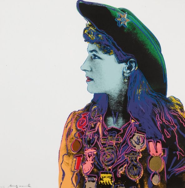 Andy Warhol made this screenprint, "Eva Mudocci," with bold color and simplified forms. Screenprinting is inherently a process of reproduction. The image is transferred to a screen, and ink is forced through the open areas, creating a print. Warhol embraced this technique, appreciating its potential for mass production and the way it flattened images, reducing them to their essence. The flatness in Mudocci allows color to take center stage. Notice how Warhol uses contrasting hues to define shapes and create visual impact. The simplified forms and bold colors create a sense of immediacy and accessibility. Warhol's use of screenprinting democratized art production. It allowed for the creation of multiples, blurring the lines between high art and commercial reproduction. This challenges traditional notions of artistic value, emphasizing the importance of both material and context in understanding the work's full meaning.